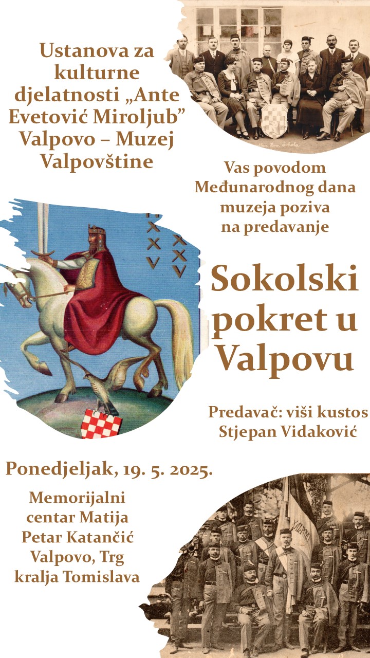 Povodom obilježavanja Međunarodnog dana muzej Muzej Valpovštine organizira predavanje višeg kustosa Stjepana Vidakovića „Sokolski pokret u Valpovu koje će se održati 19. svibnja 2025. godine u Memorijalnom centru Matije Petra Katnačića u Valpovu na Trgu kralja Tomislava s početkom u 19:00 sati. S obzirom da je Međunarodni savjet muzeja (ICOM) povodom ovogodišnje manifestacije, pored ostalih preporuka, predložio da se posjetiteljima ukaže na važnosti istraživačkog i znanstvenog rada koji prethodi muzejskim sadržajima, na predavanju će biti uvodni osvrt na metodološki pristup realizaciji izložbe „Sokolski pokret u Valpovštini“ otvorene 5. prosinca prošle godine. Ukazat će se na način prikupljanja građe kao i kronologiju nastanka izložbe kao i rezultate koji su za vrijeme priprema postignuti. Nakon uvoda uslijedit će predavanje o sokolskim društva u Valpovu koja su u različitim periodima djelovala od 1907. pa do 1941. godine. Na kraju predavanja biti će priređena prigodna zakuska.