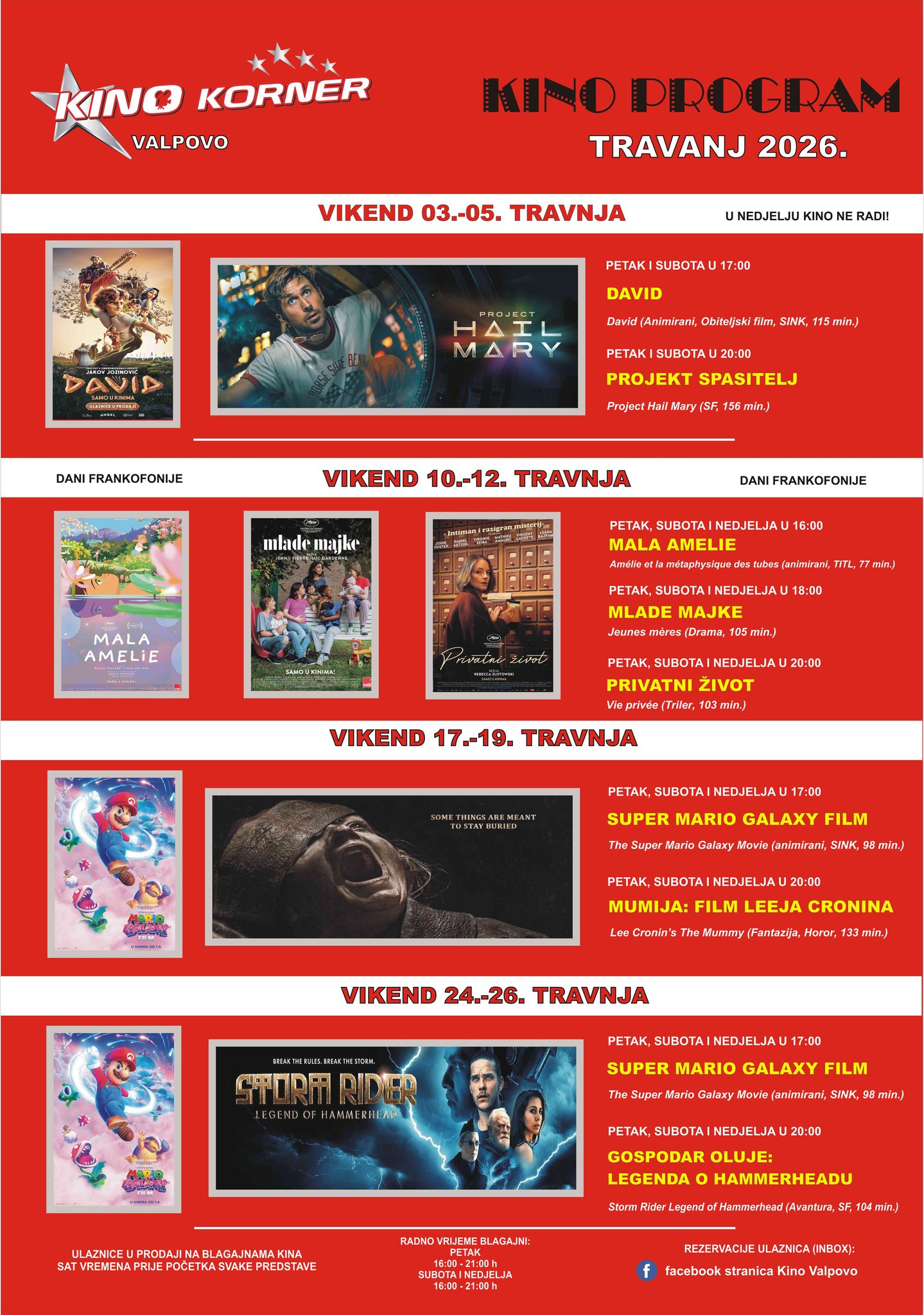 RASPORED PRIKAZIVANJA FILMOVA ZA VIKEND 17.-19. TRAVNJA Petak, subota i nedjelja u 17:00 sati „Super Mario Galaxy film“ (The Super Mario Galaxy Movie) Ž